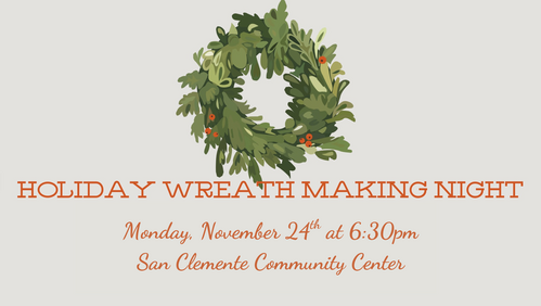 Ladies, join us for a festive night as we prepare our hearts and homes for the holiday season! We will be having a wreath-making night on Monday, November 24th at 6:30pm, in the cozy Fireside Room at the San Clemente Community Center.